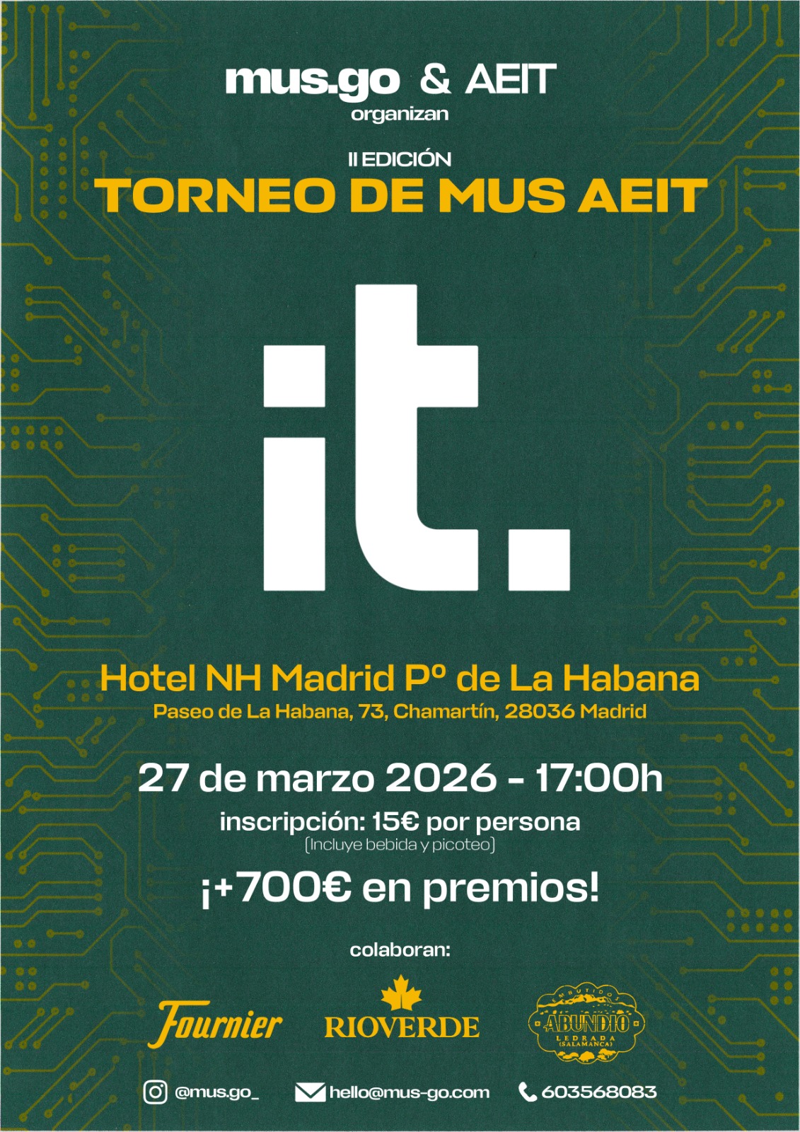 Tras el éxito de la primera edición, la Asociación Española de Ingenieros de Telecomunicación (AEIT) celebrará la segunda edición de su Torneo de Mus, un evento organizado junto a la empresa Mus.go que tendrá lugar el viernes 27 de marzo en el Hotel NH del Paseo de La Habana de Madrid.