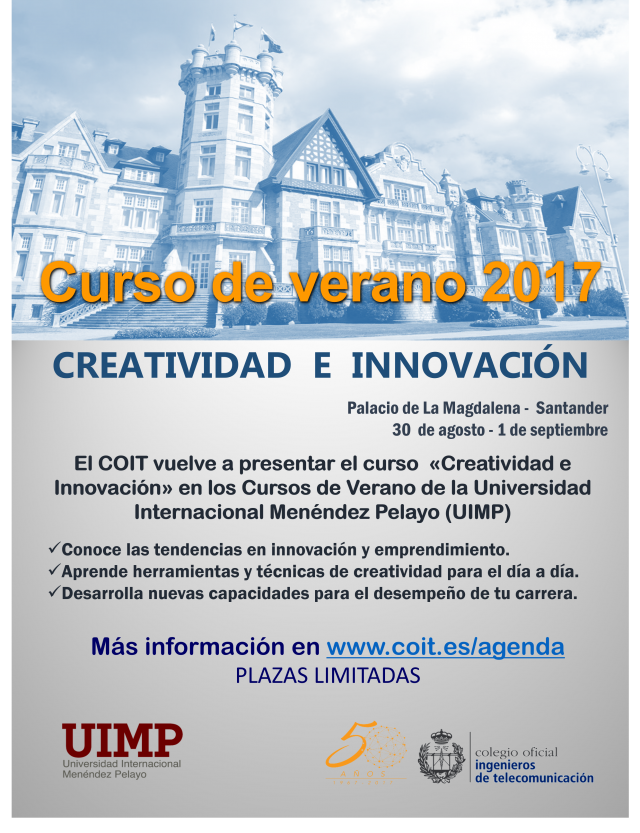 El COIT vuelve a programar el curso de «Creatividad e Innovación» en los Cursos de Verano de la Universidad Internacional Menéndez Pelayo (UIMP) con la intención de despertar el espíritu innovador de los asistentes, dotarles de discurso y de herramientas que les permitan incorporar la innovación en su trabajo, en sus equipos y, por ende, en sus organizaciones.