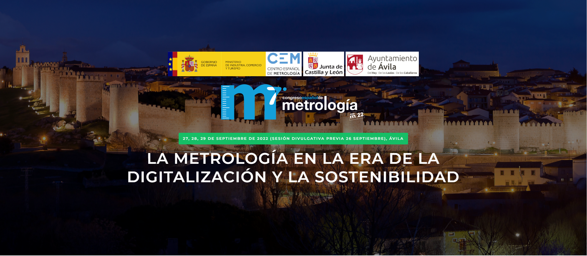 El Centro Español de Metrología en colaboración con la Junta de Castilla y León, promueve la celebración del 7º Congreso Español de Metrología. El congreso tendrá lugar en el Centro de Congresos y Exposiciones Lienzo Norte, Ávila, los días 27, 28 y 29 de septiembre de 2022, con una sesión previa el lunes 26 de septiembre por la tarde para divulgación y recepción a las autoridades y los participantes.